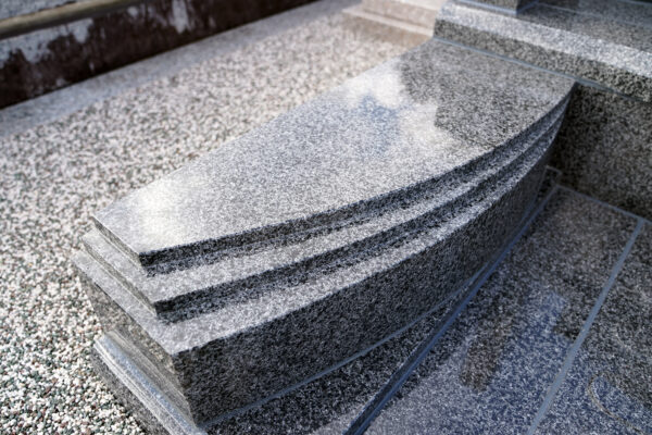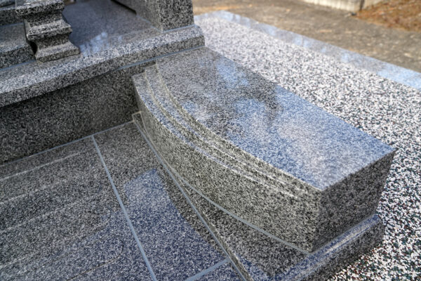 統一感を出すために 竿石、羽目石、親柱にデザイン性の高いR加工を付けています。